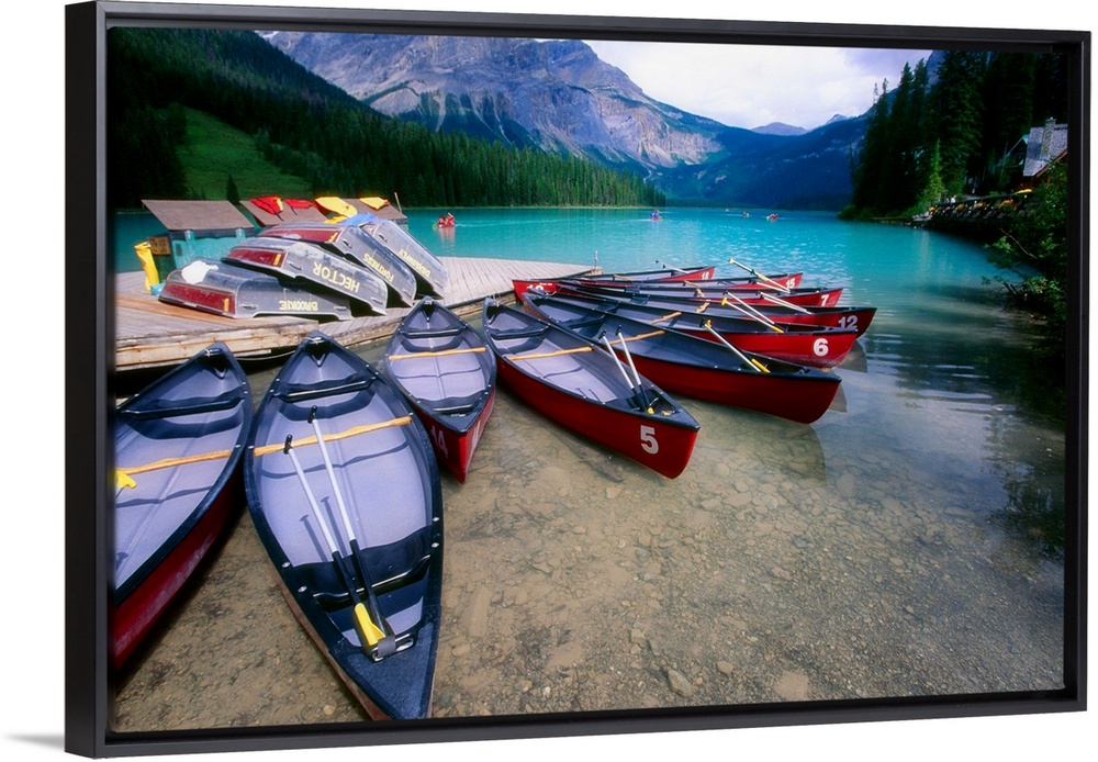 <p>Red Canoes at a Dock, Emerald Lake, British Columbia, Canada</p>