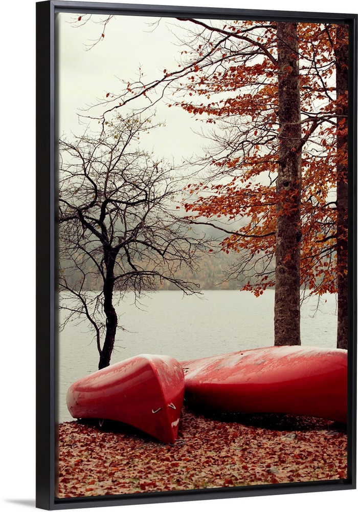 <p>Red canoes parked on fallen autumn leaves by the lake.</p>