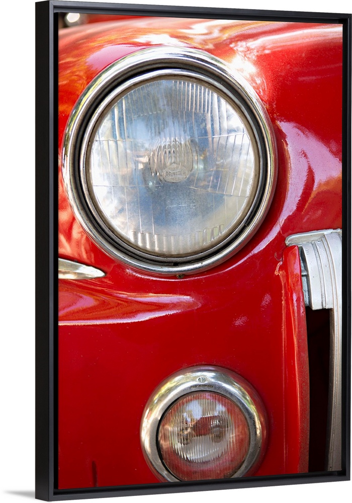 <p>Close-up photograph of the headlight of a red vintage car in Cuba.</p>