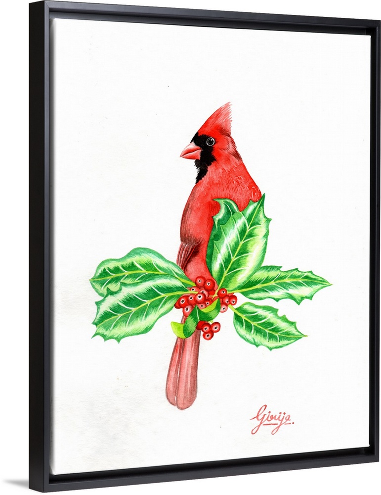 <p>The adult male of northern cardinal is a brilliant crimson red color with a black face mask over the eyes, extending to the upper chest. This vibrant red bird is painted in watercolor on paper.</p>