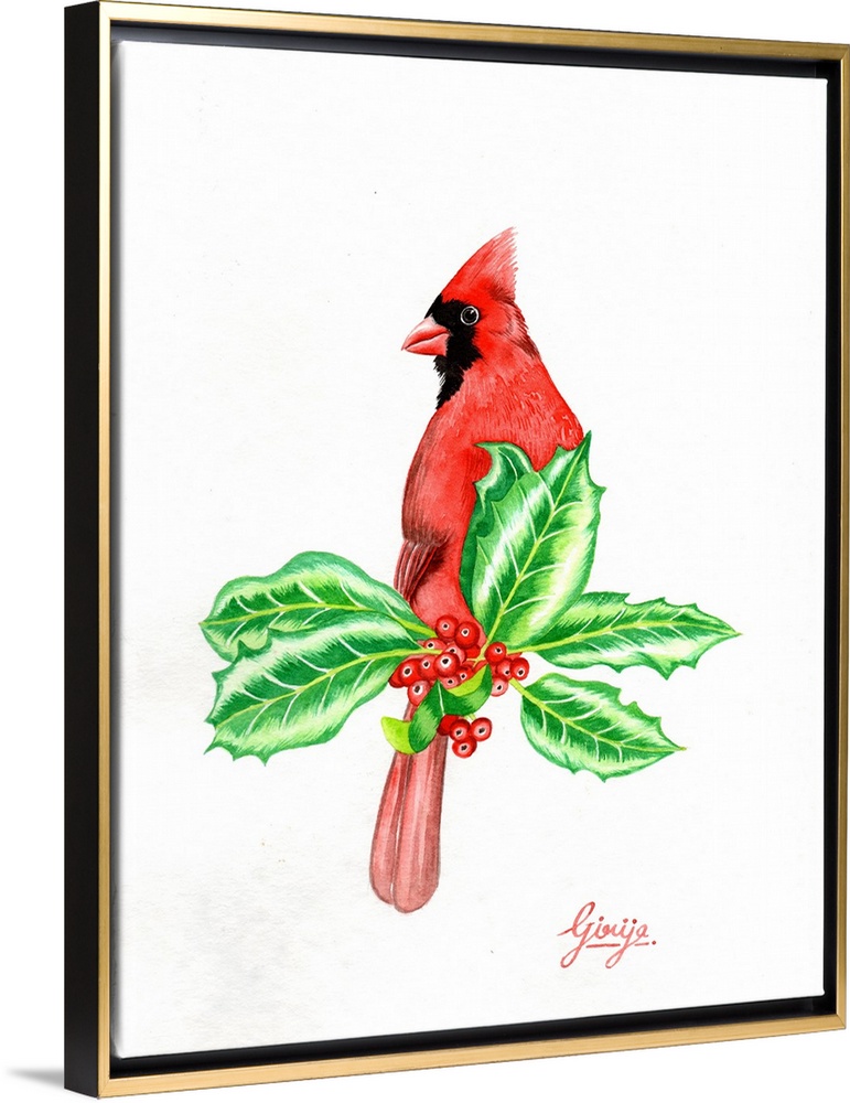 <p>The adult male of northern cardinal is a brilliant crimson red color with a black face mask over the eyes, extending to the upper chest. This vibrant red bird is painted in watercolor on paper.</p>