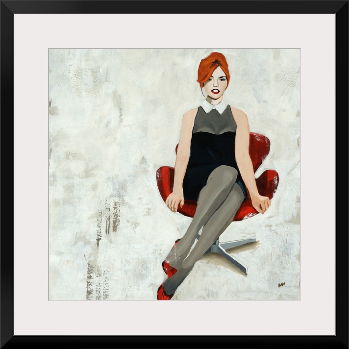 <p>Painting of a woman in a short dress and high heels, sitting in a retro office chair, on a patchy background in light neutral tones.</p>