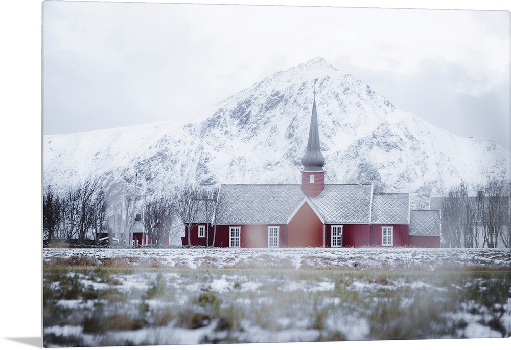 <p>Red church of Flakstad in winter fog, Flakstad, Nordland county, Lofoten Islands, Norway, Scandinavia, Europe</p>