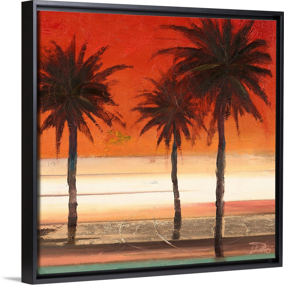 <p>A painting of three palm trees with a deep red and orange sunset in the background.</p>