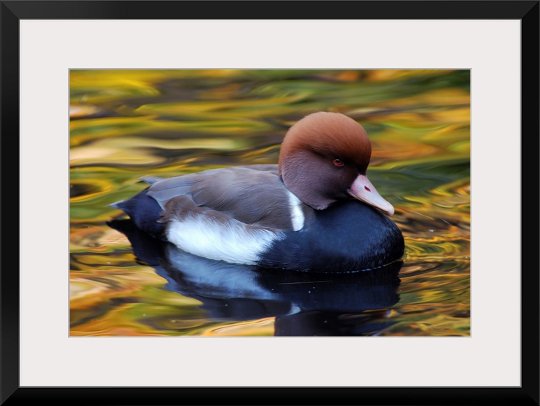 <p>Red-crested pochard duck, Netta rufina, in pond with autumn colors. New York.</p>