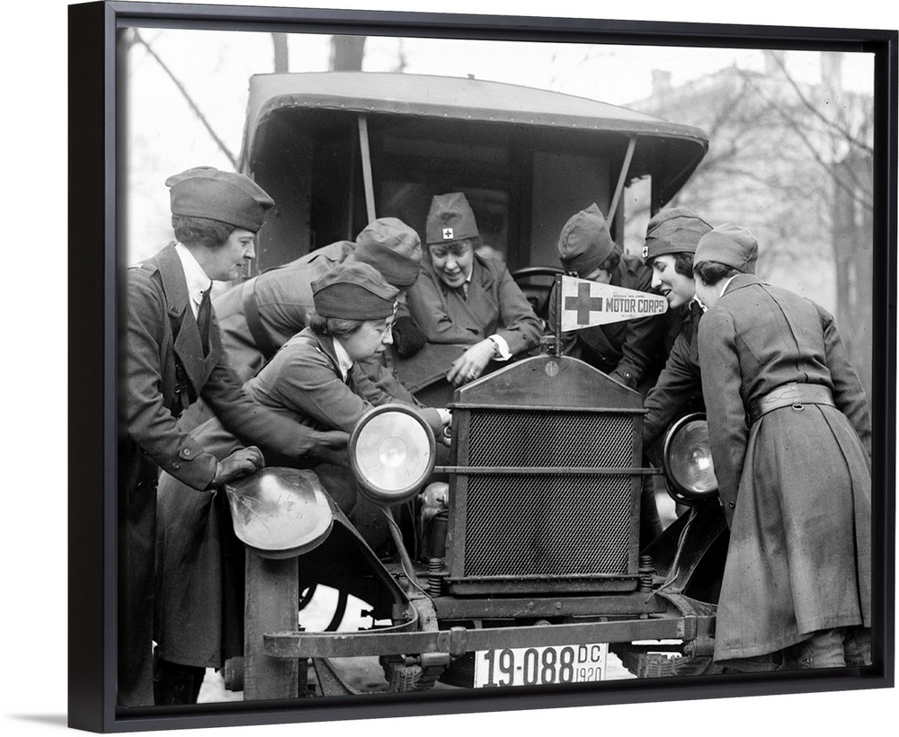 <p>Members of the American Red Cross Motor Corps learning to fix an automobile engine, c1920.</p>