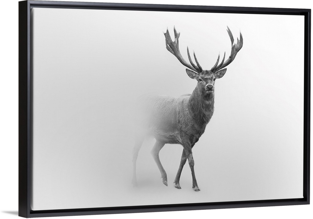 <p>Red deer walking in a foggy background.</p>