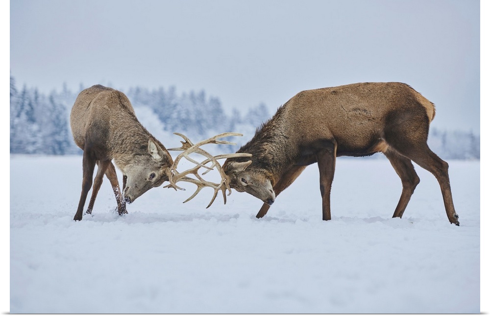 <p>Red deer (Cervus elaphus) fighting on a snowy meadow, Bavaria, Germany</p>