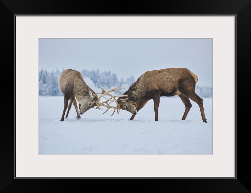 <p>Red deer (Cervus elaphus) fighting on a snowy meadow, Bavaria, Germany</p>