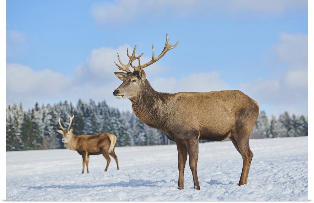 <p>Red deer (Cervus elaphus) on a snowy meadow, Bavaria, Germany</p>
