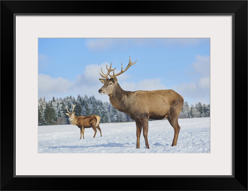 <p>Red deer (Cervus elaphus) on a snowy meadow, Bavaria, Germany</p>