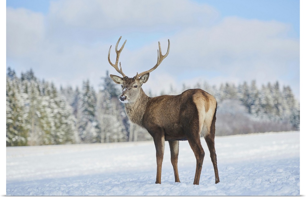 <p>Red deer (Cervus elaphus) on a snowy meadow, Bavaria, Germany</p>