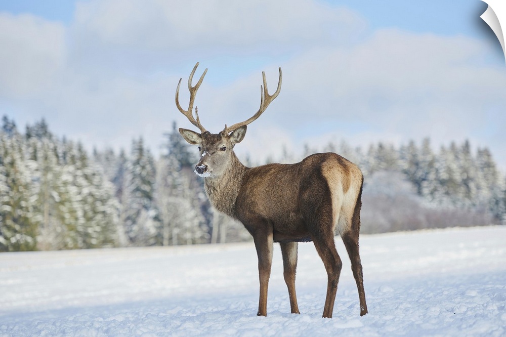 <p>Red deer (Cervus elaphus) on a snowy meadow, Bavaria, Germany</p>