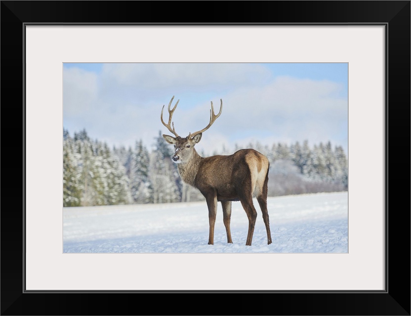 <p>Red deer (Cervus elaphus) on a snowy meadow, Bavaria, Germany</p>