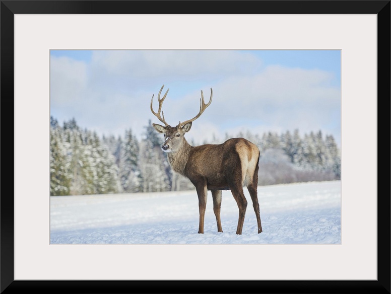 <p>Red deer (Cervus elaphus) on a snowy meadow, Bavaria, Germany</p>