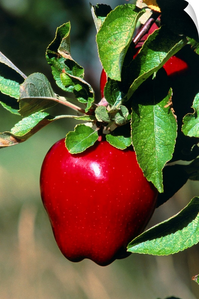 <p>Apples. A ripe Red Delicious apple on the branch of an apple tree. Photographed in Canada.</p>