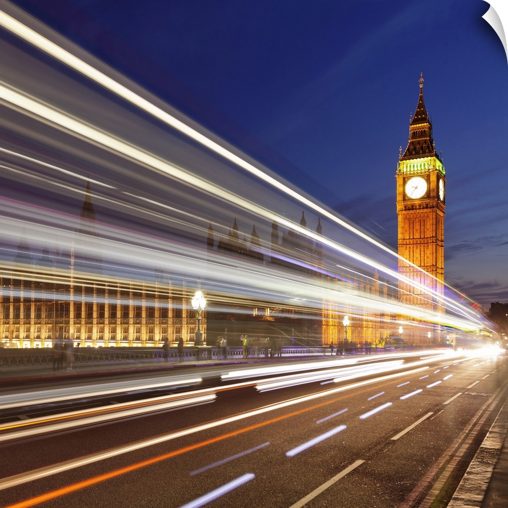 <p>Motion blurred red double decker bus, Houses of Parliament, Big Ben, Westminster Bridge, London, England, United Kingdom, Europe</p>