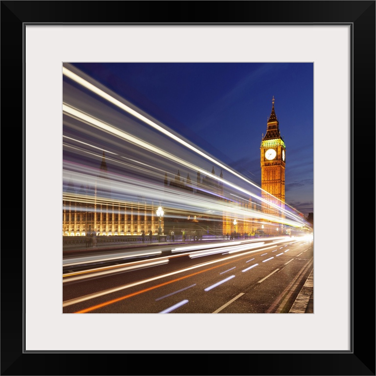 <p>Motion blurred red double decker bus, Houses of Parliament, Big Ben, Westminster Bridge, London, England, United Kingdom, Europe</p>