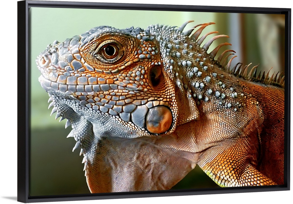 <p>Portrait of a large red iguana with scaly skin.</p>