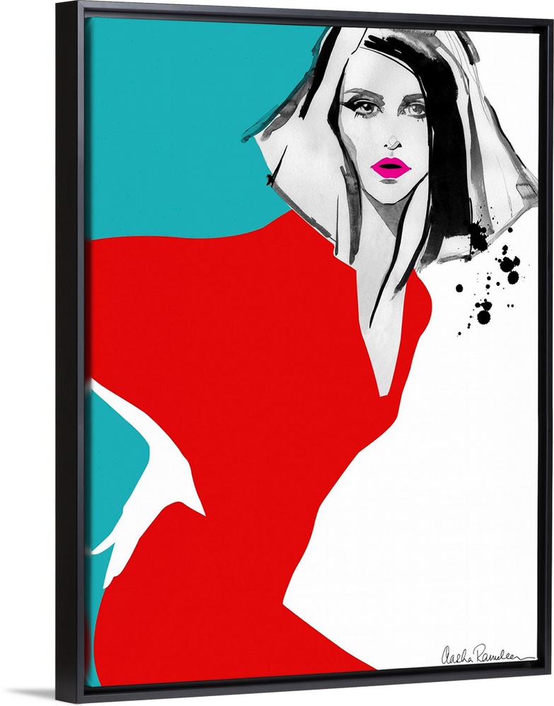 <p>Contemporary fashion artwork of a woman wearing a bright red dress.</p>