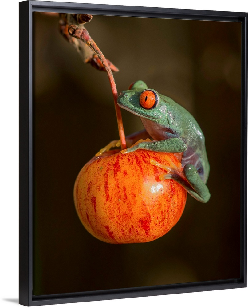 <p>A red-eyed tree frog sitting on a red fruit.</p>