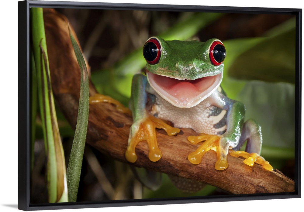 <p>Red-eyed tree frog sitting on the branch and smiling.</p>