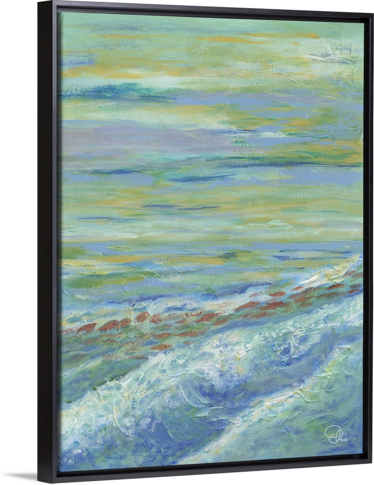 <p>Contemporary artwork of the ocean with shallow waves, under a cloudy sky.</p>