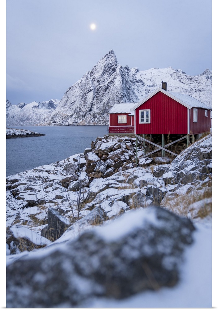 <p>Red fishermen's cabins covered with snow at dusk, Hamnoy, Nordland county, Lofoten Islands, Norway, Scandinavia, Europe</p>