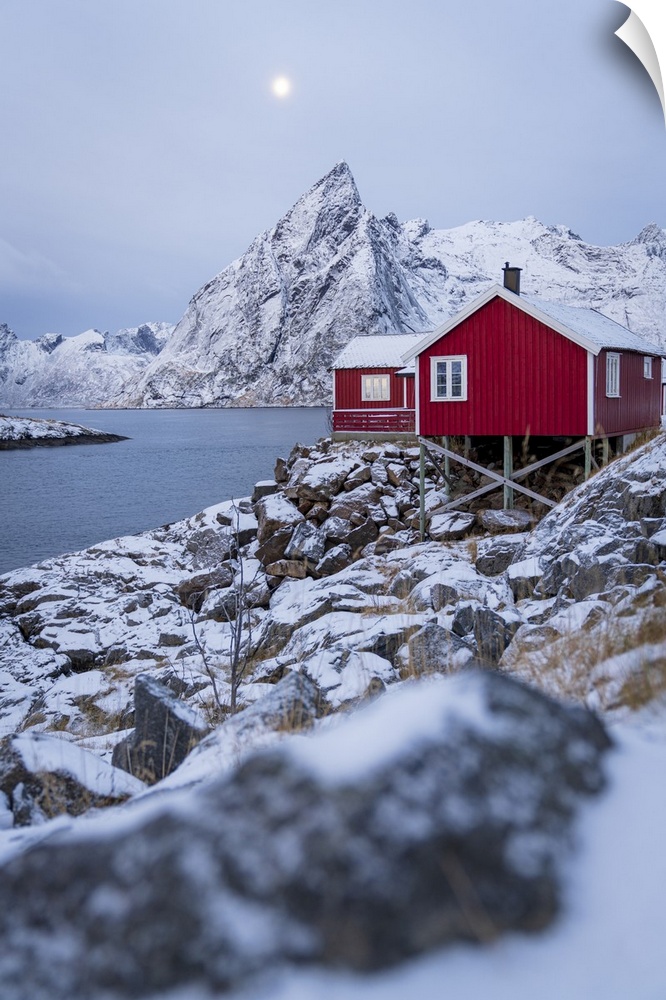 <p>Red fishermen's cabins covered with snow at dusk, Hamnoy, Nordland county, Lofoten Islands, Norway, Scandinavia, Europe</p>