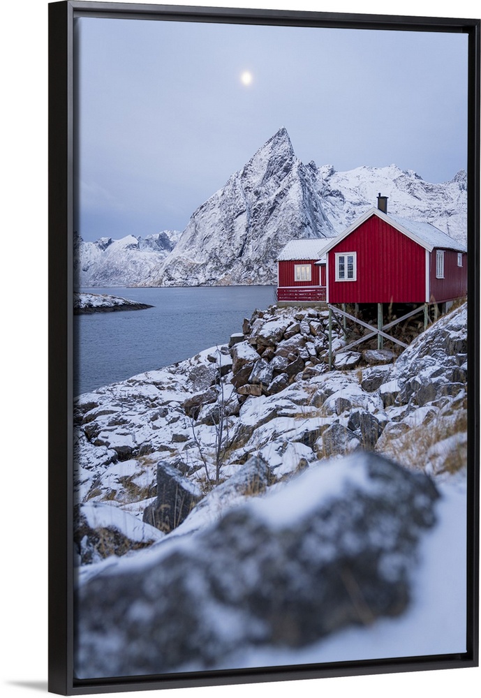 <p>Red fishermen's cabins covered with snow at dusk, Hamnoy, Nordland county, Lofoten Islands, Norway, Scandinavia, Europe</p>