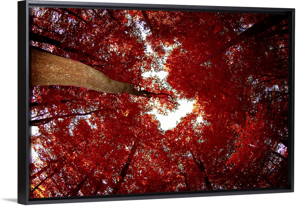 <p>Huge photograph shows a view from the ground looking up at the top of a crowded forest as light tries to shine through the brightly colored leaves.</p>