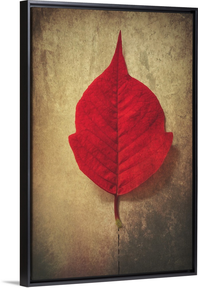 <p>Photograph of perfect, bright red leaf on a neutral colored ground with a black dotted line leading directly to the stem.</p>