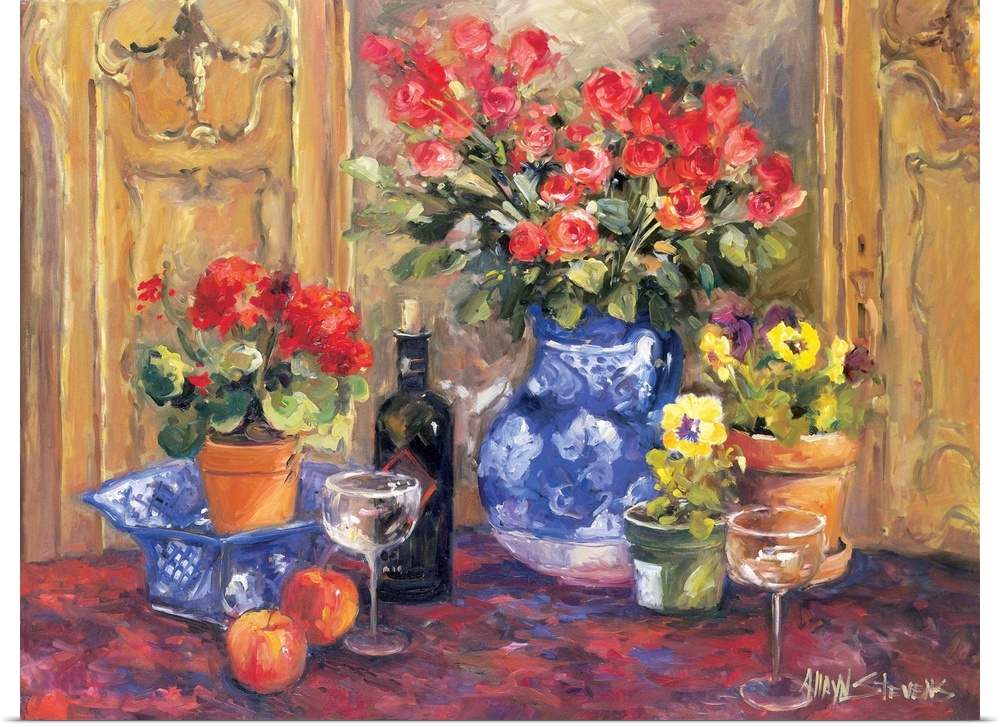 <p>Fine art oil painting still life of red roses, flowers, fruit and wine on a table by Allayn Stevens.</p>