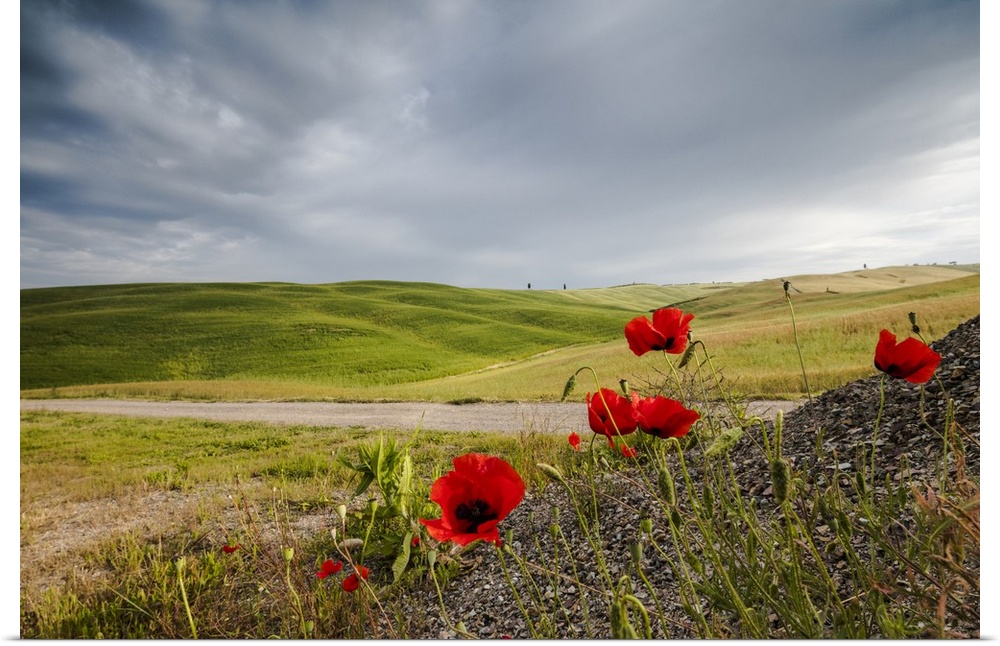 <p>Red flowers and clouds frame the gentle green hills of Val d'Orcia, Province of Siena, Tuscany, Italy</p>