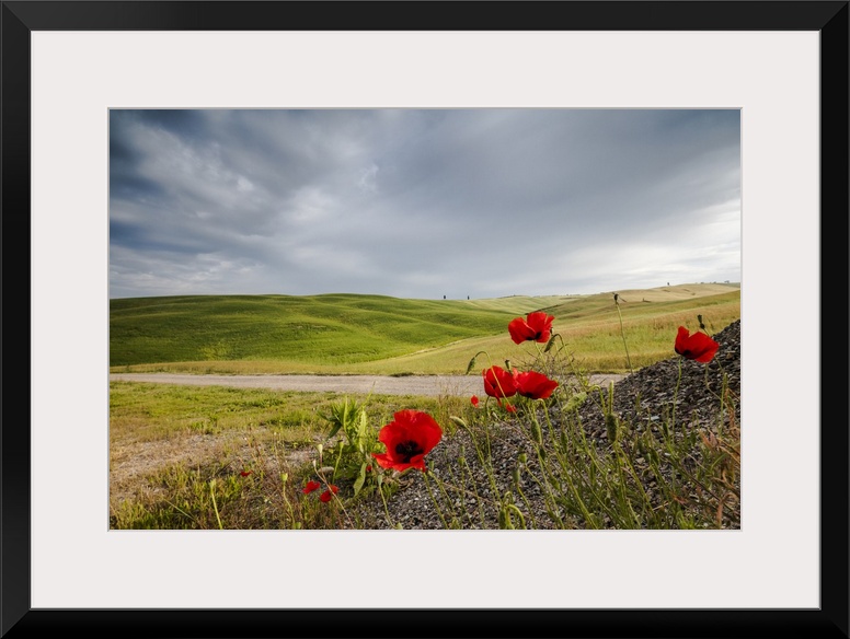 <p>Red flowers and clouds frame the gentle green hills of Val d'Orcia, Province of Siena, Tuscany, Italy</p>
