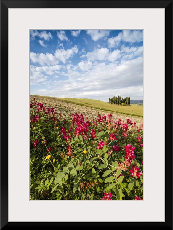 <p>Red flowers frame the gentle green hills of Val d'Orcia, Province of Siena, Tuscany, Italy</p>