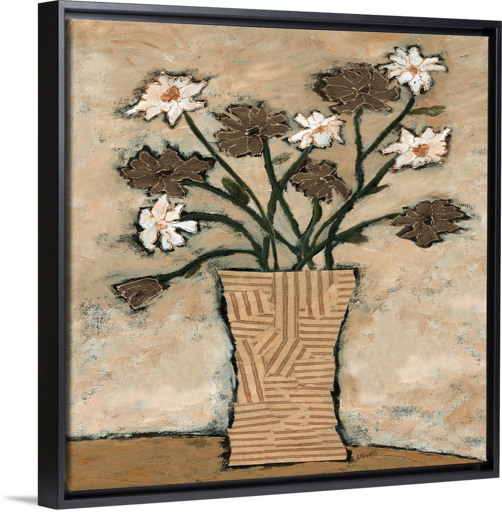 <p>Contemporary artwork of a bouquet of white and brown cosmos flowers.</p>