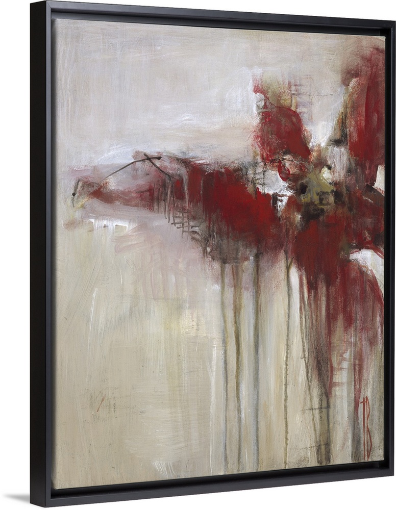 <p>Contemporary abstract painting using deep red tones dripping against a neutral toned background.</p>