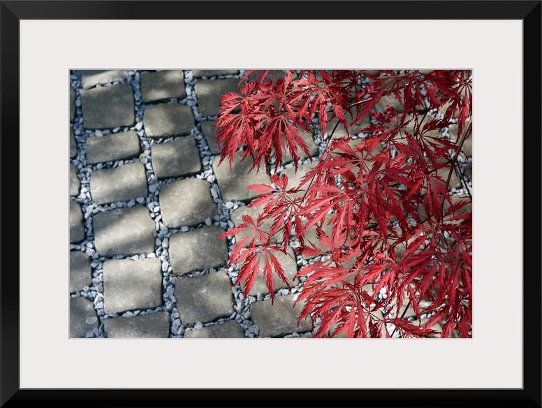 <p>Red foliage of Japanese maple (Acer palmatum) over grey cobbles</p>
