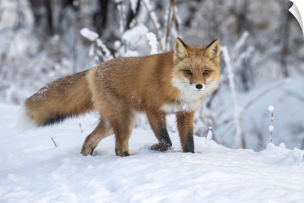 <p>Red fox (vulpes vulpes) in snow, Campbell creek area, south-central Alaska. Alaska, united states of America.</p>