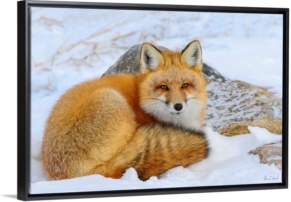 <p>Alert Red Fox (Vulpes vulpes) resting in snow near Hudson Bay, Churchill, MB, Canada.</p>