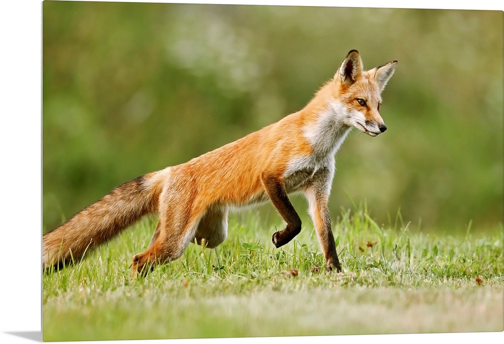<p>Red fox (vulpes vulpes) walking on grass. Montreal, Quebec, Canada.</p>