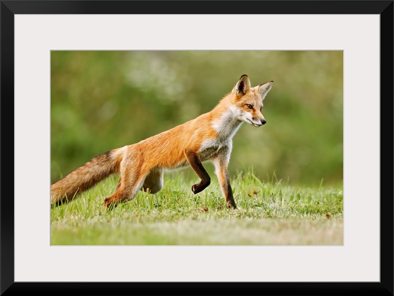 <p>Red fox (vulpes vulpes) walking on grass. Montreal, Quebec, Canada.</p>