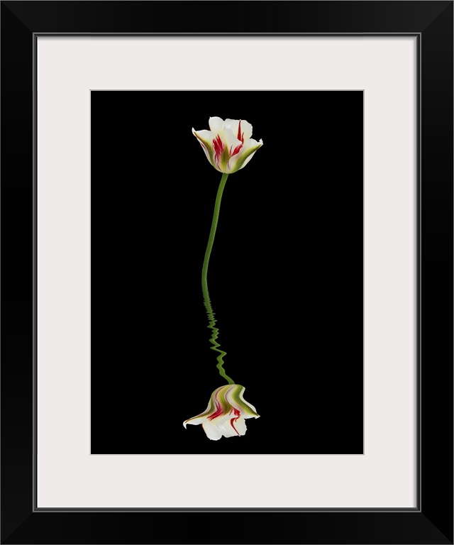 <p>Red, green, and white tulip reflected in water on a black background.</p>