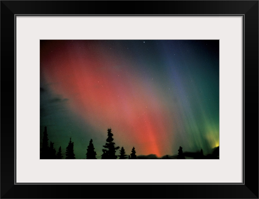<p>A forest of pine trees is silhouetted against the glowing aurora borealis in the Arctic sky. A few stars shine through the colorful waves of light.</p>