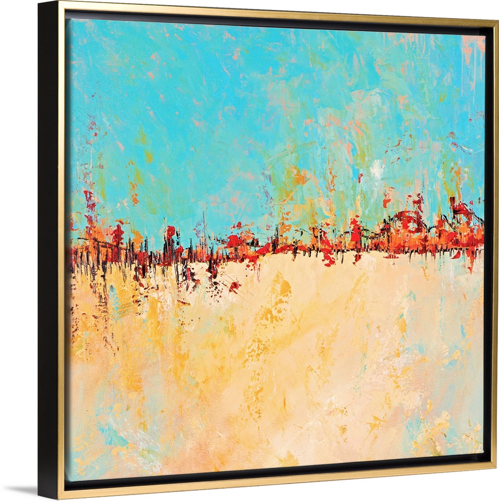 <p>Contemporary abstract painting with bright turquoise and gold separated by intense orange.</p>
