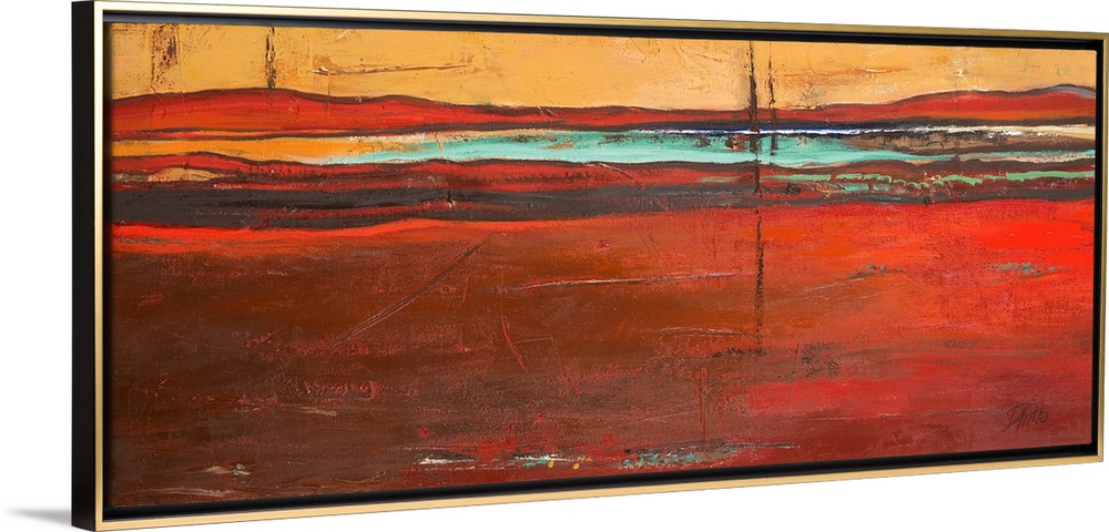<p>Contemporary abstract painting with horizontal strokes of deep color, resembling hills on the horizon of a desert landscape.</p>