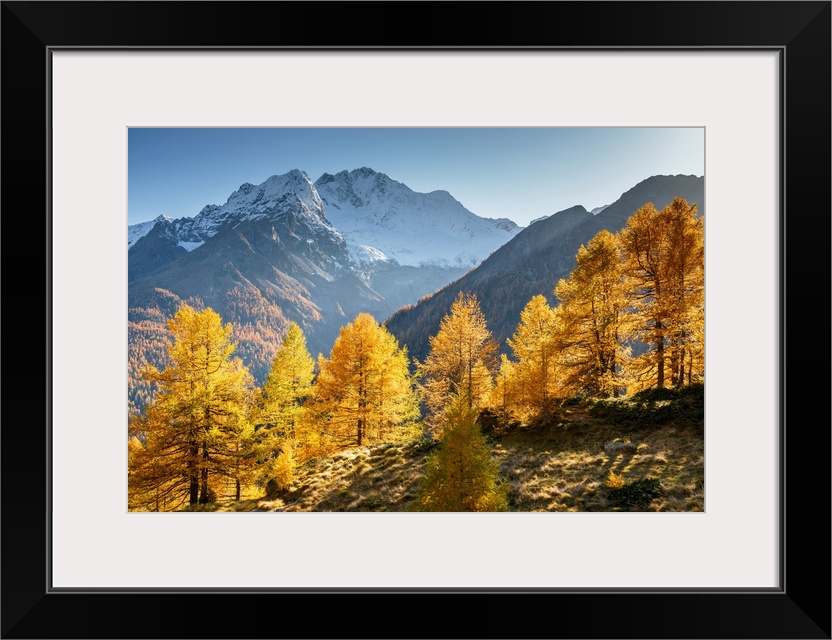 <p>Red larches with snowy Mount Disgrazia in the background, Malenco Valley, Valtellina, Sondrio, Lombardy, Italy</p>