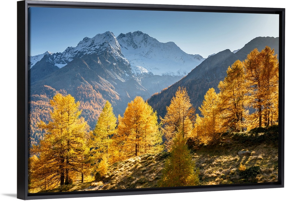<p>Red larches with snowy Mount Disgrazia in the background, Malenco Valley, Valtellina, Sondrio, Lombardy, Italy</p>