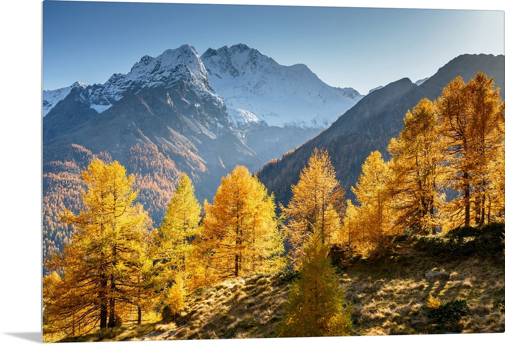 <p>Red larches with snowy Mount Disgrazia in the background, Malenco Valley, Valtellina, Sondrio, Lombardy, Italy</p>